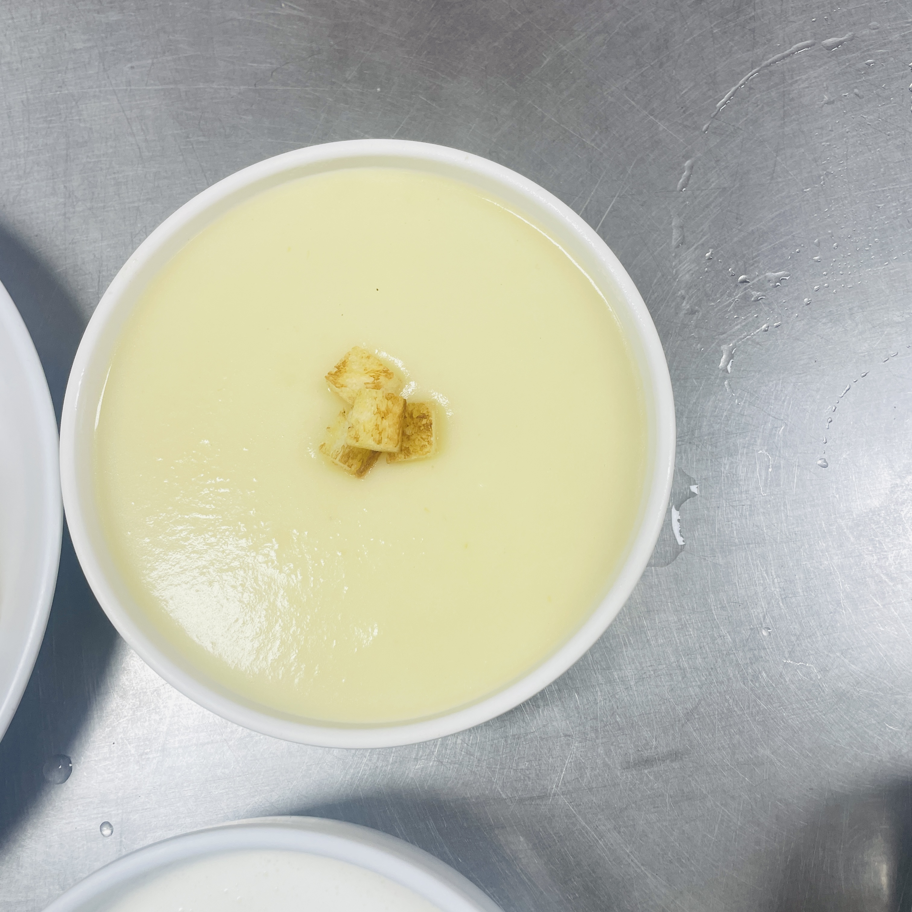 버터를 녹인 후 양파와 대파를 볶은 후 최대한 얇게 슬라이스 한 감자를 넣어 버터향이 입게 볶은 후 물을 넣어 감자를 푹 익인 후 체에 걸러 생크림을 넣어 부드럽게 끓여내는 기본적인 수프입니다. 하지만 점도와 간이 맞지 않으면 쉽게 실패할 수 있는 메뉴죠.