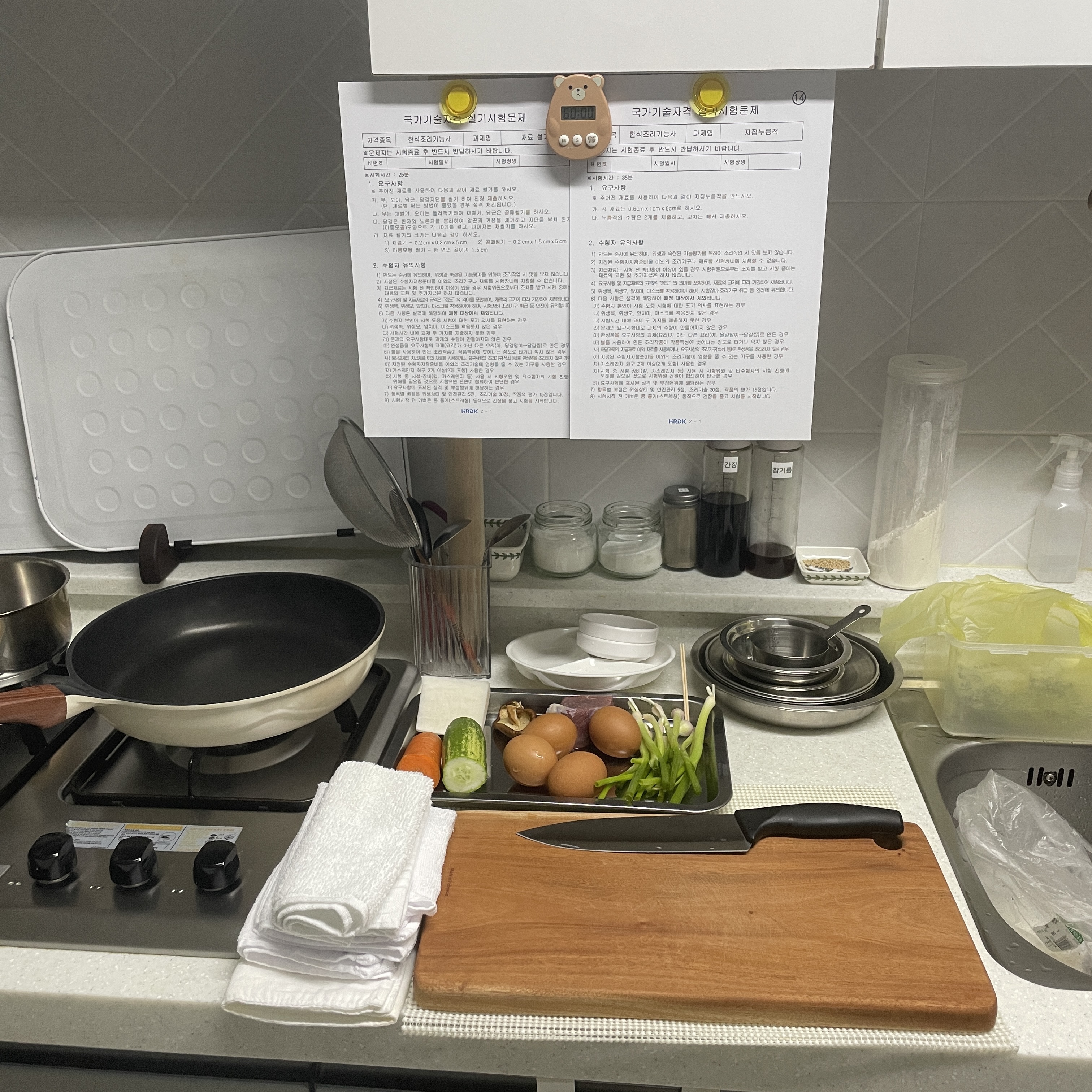 이 짧은 시간 안에 재료 손질, 조리, 플레이팅까지 모두 마쳐야 하기 때문에 연습할 때도 실제 시험처럼 환경을 세팅해 보는 것이 정말 중요합니다. 제가 추천하는 방법은 시험지 출력본을 눈높이에 붙여두고, 시작 전부터 타이머를 누르고 시작하는 거예요.