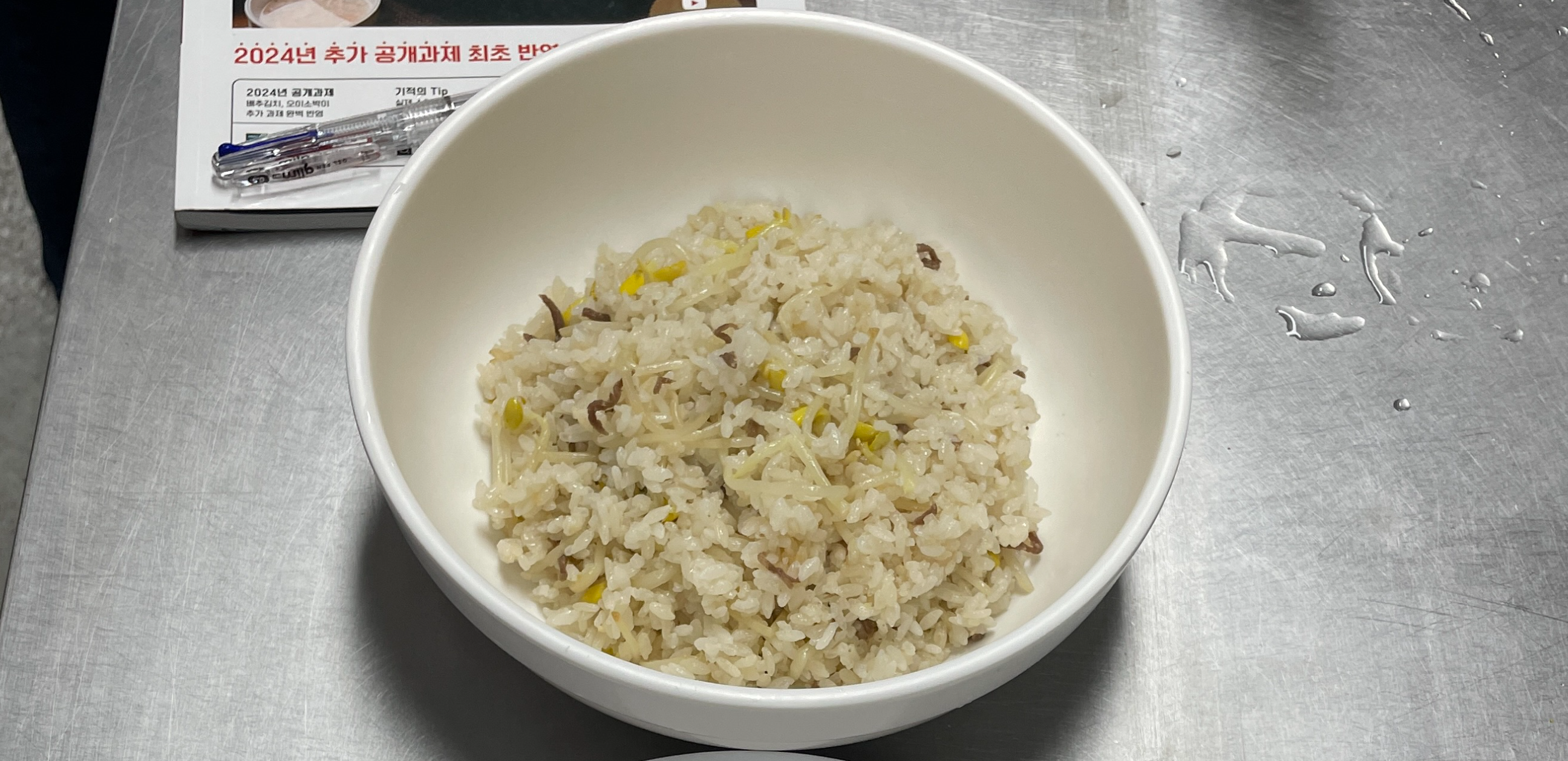 밥알이 고슬고슬하고 콩나물이 탱탱하게 익어야 좋은 평가를 받을 수 있습니다. 실습에서는 수분이 많아지지 않도록 끓이는 시간을 조절하는 데 신경을 많이 썼고, 뜸 시간은 정확히 10분을 지켜 균일하게 익히는 데 성공했어요.