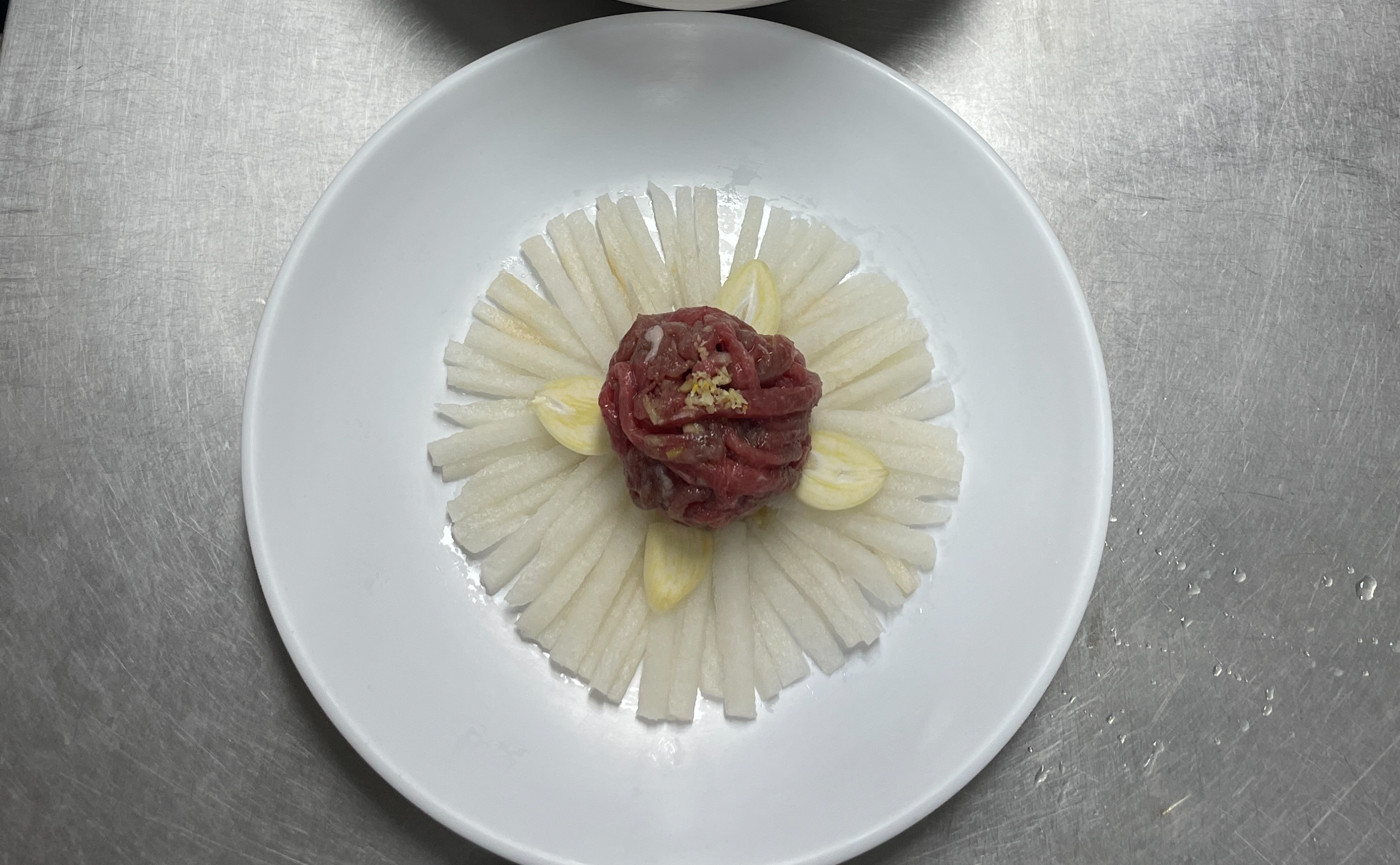 5. 접시에 배를 돌려 담고 가운데 소고기를 담은 후, 소고기 주변으로 마늘 편을 돌려 꽂아줍니다.